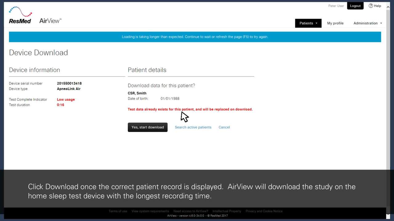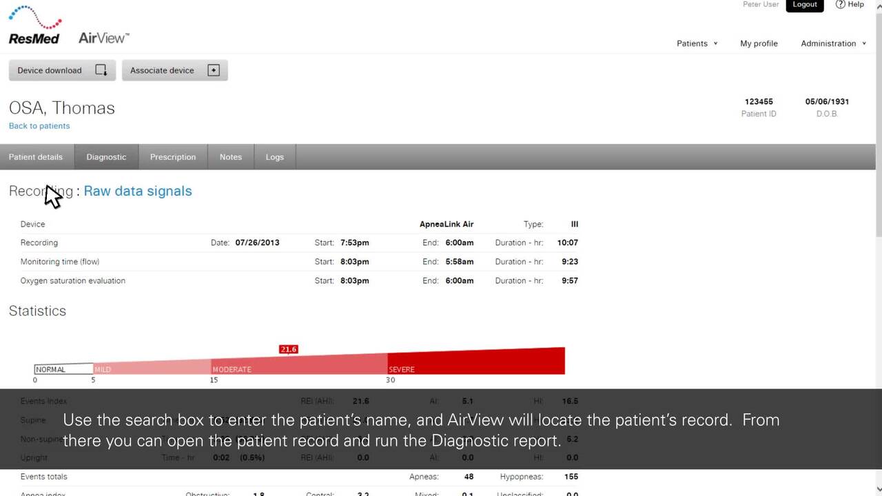 Onlineåtkomst till patienternas ApneaLink™ Air-information från sömnregistrering i hemmet direkt via den säkra* AirView-servern, en molnbaserad lösning för patienthantering som tar Resmeds vårdlösningar till en ny nivå. AirView eliminerar flaskhalsar och ger ett effektivare arbetsflöde, från den inledande screeningen till behandling.